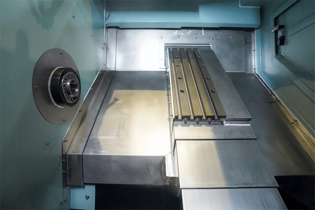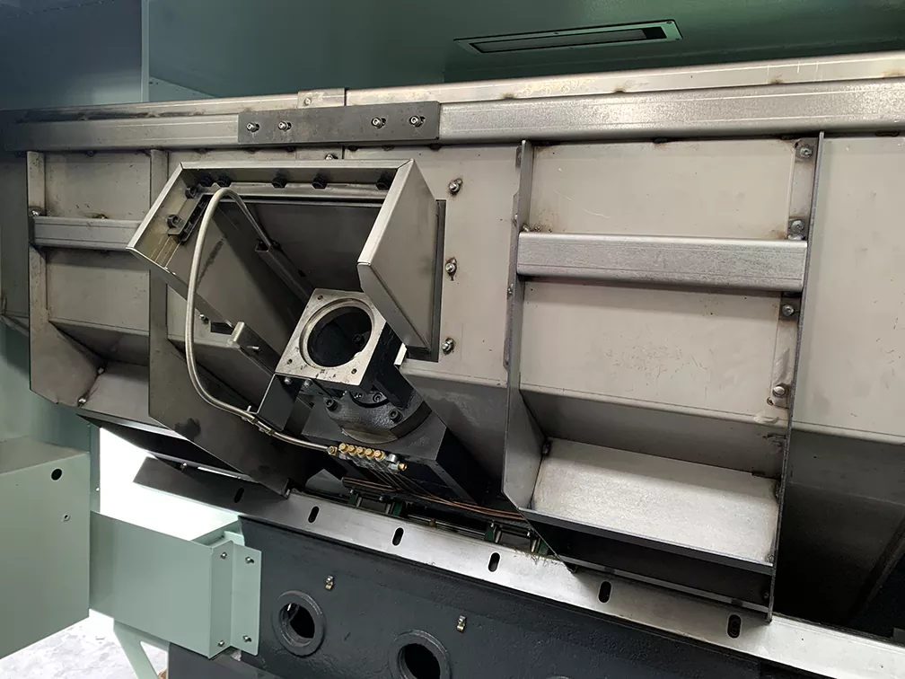 Design de pat înclinat de 45 de grade, convenabil pentru operatori să prindă piesele de lucru în sus și în jos, și îndepărtarea netedă a cipurilor. Axa X ultra mare are o lovitură de 900, iar axa Z are o cursă de 350, ceea ce face ca uneltele de 46 de rânduri să fie ușor de aranjat pentru a aranja cuțite. De asemenea, poate fi echipat cu o turelă și un cap de putere. Compusul de frezare simplu modernizat cu mai multe opțiuni, poate fi echipat cu un cap de tăietor zburător pentru a atinge funcția de legătură cu 4 axe. Corpul de pat turnat dintr-o bucată asigură stabilitatea și exactitatea mașinii asamblate, cu o unitate independentă de ax.